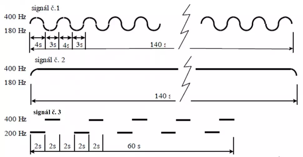 - Signál č. 2 zkušební tón používá se pro zkoušky sirén. Zvuková ukázka »